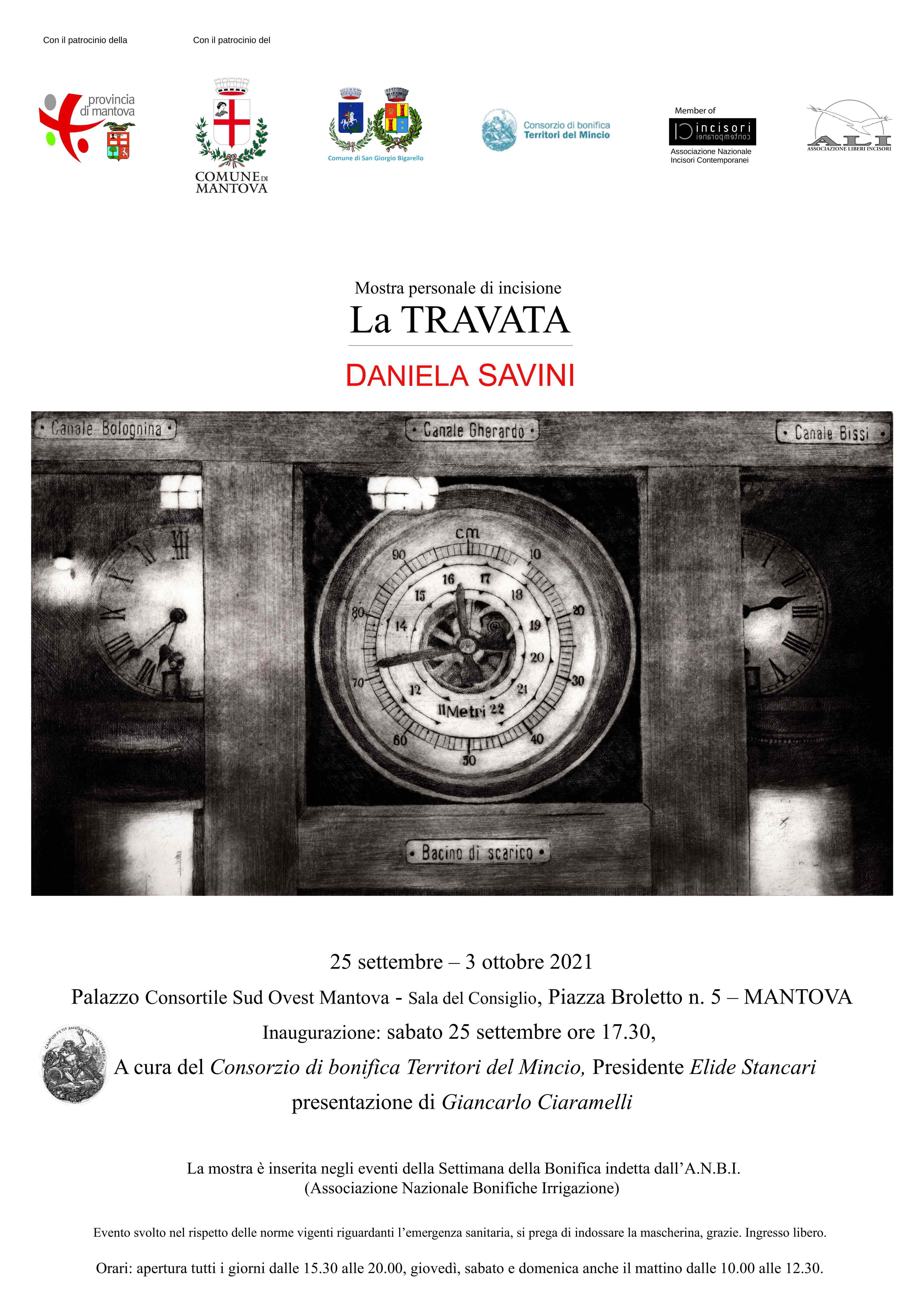 Nel Palazzo Consortile Sud Ovest Mantova, durante la settimana della Bonifica e dell’irrigazione indetta dall’"ANBI (Associazione nazionale consorzi gestione e tutela del territorio e acque irrigue) che si terrà quest’anno dal 25 settembre al 3 ottobre, verrà esposta la mostra di incisione di Daniela Savini. Mostra a cura dal Consorzio di Bonifica Territori del Mincio, e presentata da Giancarlo Ciaramelli sabato 25 settembre ore 17.30.