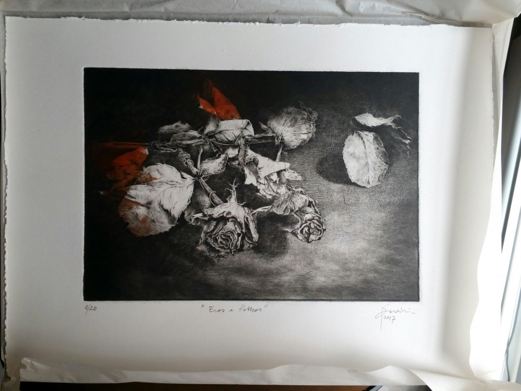 tre poesie, 15 fotografie ed una incisione a puntasecca su plexiglas 210 x 300 mm (in cartella) dal titolo "Eros e pathos" carta Fabriano Rosaspina 35 x 50 cm;