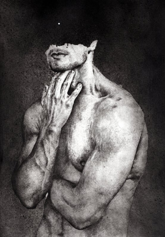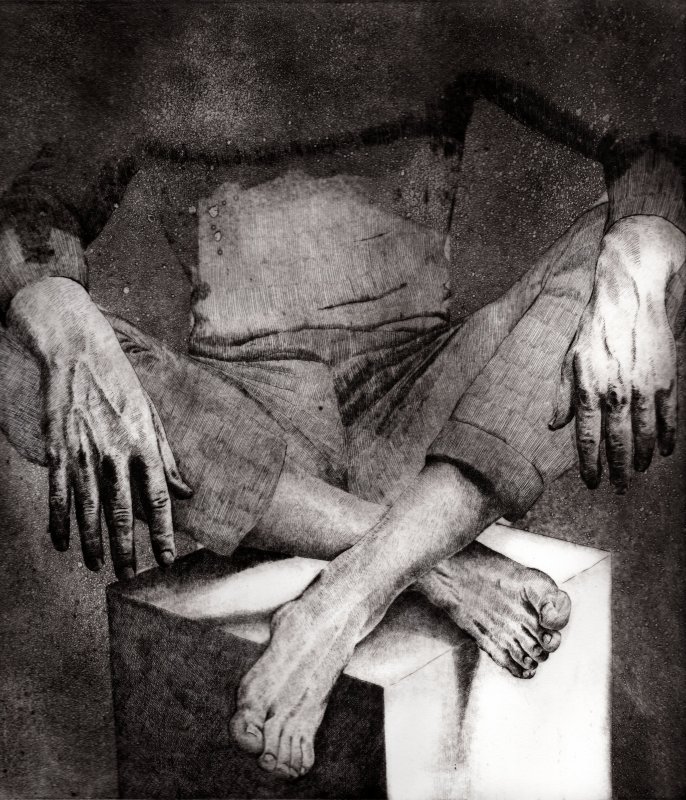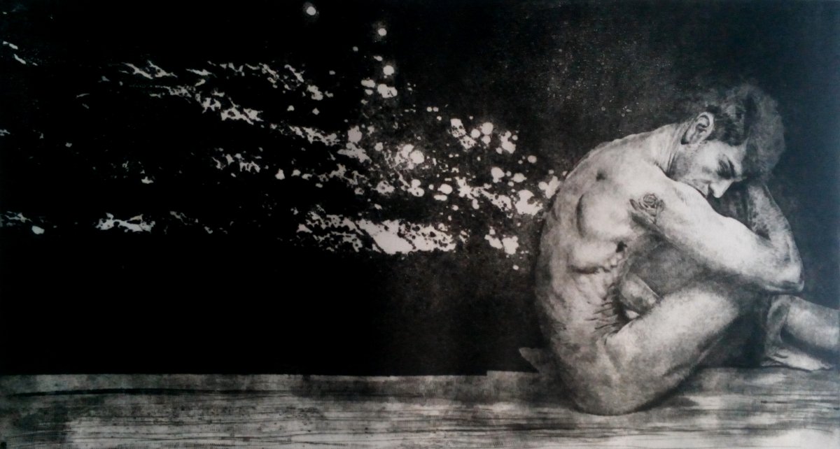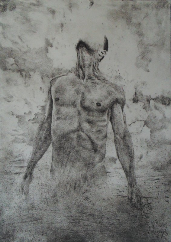 2020, Su un abisso protetto solo dal suo piedistallo, puntasecca e vernice ferromicacea cm 47 x 40