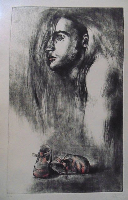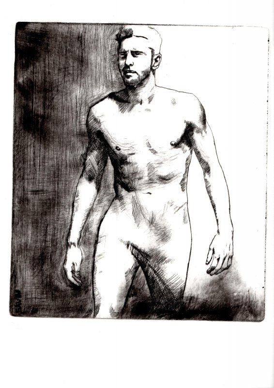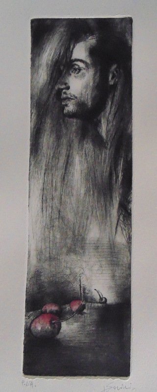 The difference in the graphic outcome between the engraving by burin and by dry-point consists, in the fact that the so-called "scraps" (metal rises at the edges of the groove), are not removed as happens with the use of burin. We want to point out that in drypoint the tool "move" the metal while the burin removes it – therefore allowing to hold the ink, generating on the sheet, those characteristic velvety blacks halos around the signs.