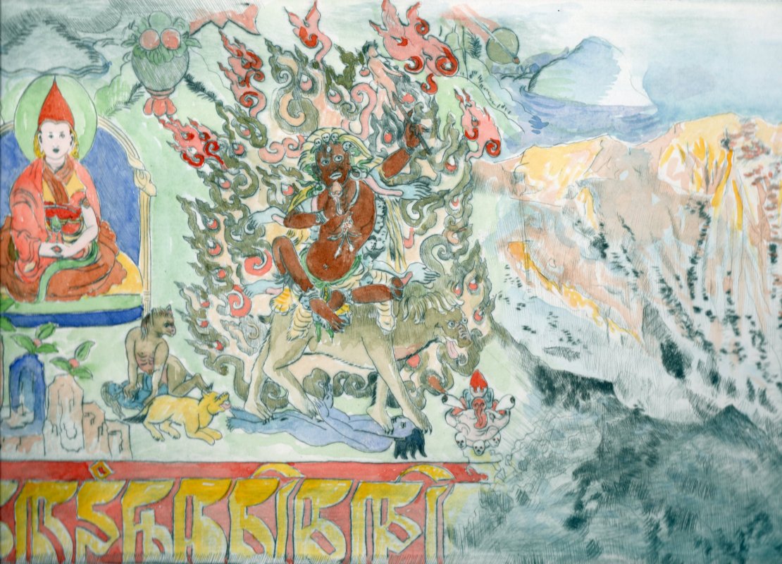 Fuoco Tantrico (sezione sacra animali totemici del tempio di Beding 3700m), puntasecca acquarellata, lastra poliver 220 x 355 mm, tiratura da 25 fogli, 120€