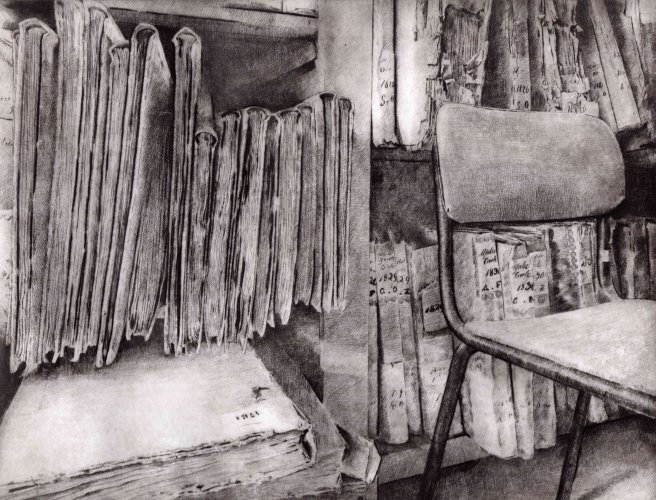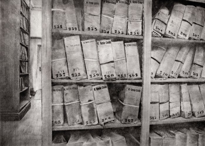 Il lavoro sottile, delicato e forte insieme che Daniela Savini ci consegna mediante le sue tavole su carta Fabriano e sono frutto di un laborioso processo di distillazione di immagini fotografiche scattate in un sito che è stato ed è luogo di studio, di formazione, di creazione artistica. L’Archivio di Stato di Mantova prima e ora l’Archivio di Stato di Modena sono i terreni privilegiati per dar forma di foglio in foglio alla reificazione dell’Archivio non solo come ufficio amministrativo statale quanto come edificio che esibisce, con la sua articolata membrana di scale, di accessi, di scaffali, di meandri la struttura portante dei fondi con le migliaia di carte sparse, di faldoni, di atti che svelano a chi sa leggerli i documenti della storia di una città, di un contado, di una provincia, di una famiglia.