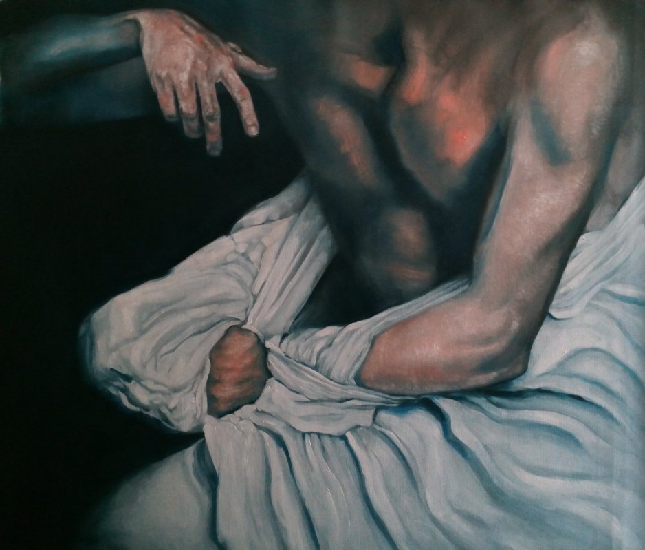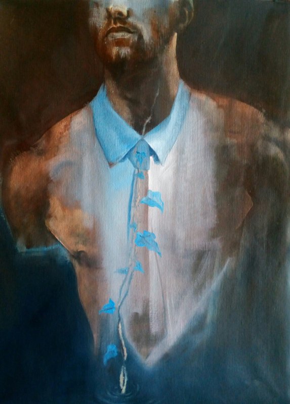 2017, olio su tela 60 x 45 cm. Trasmutazione: una morte in cui la corruzione della carne non tocca l'anima, che invece germoglia, presagio di un essere nuovo, rinnovato, ri-nato.