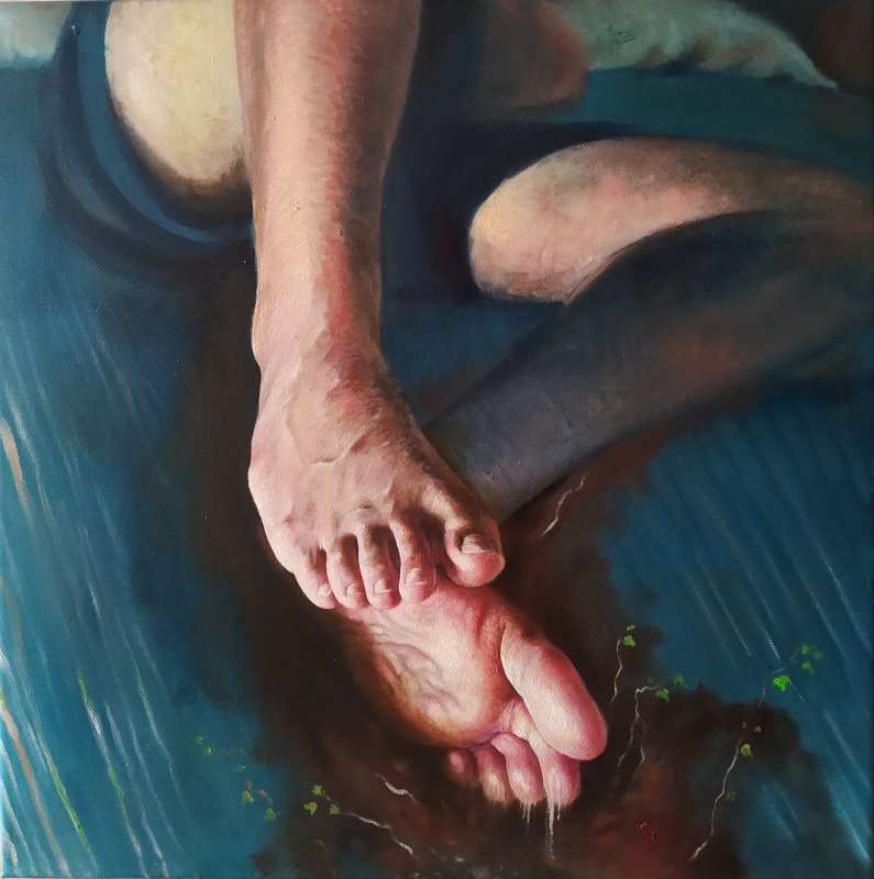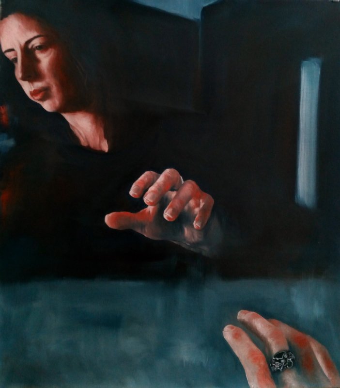 Ha già un titolo questa tua opera? È splendida. È viva, quasi ti aspetti che le dita si tocchino qualche istante dopo. Le tue opere hanno questo: coinvolgono lo spettatore, che avanza delle attese, colmate automaticamente dalle sue immagini interiori. Come in un fotogramma, ti aspetti l'immagine successiva, ti aspetti quel movimento, fuori e dentro. Se fermi il respiro, puoi sentire il battito di quei cuori, il loro respiro."