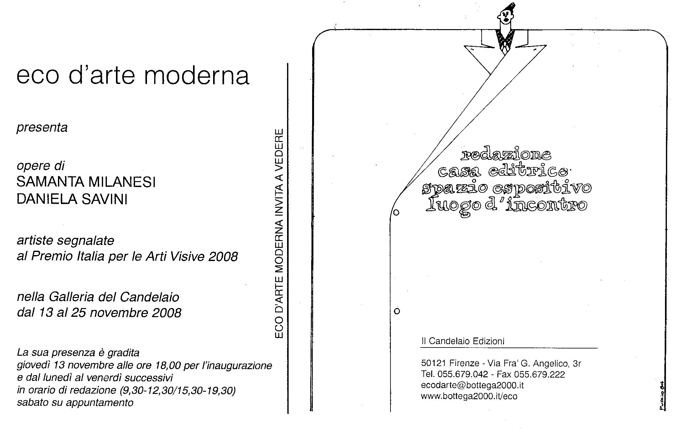 Siete tutti invitati all'inaugurazione del 13 Novembre 2008 ore 18.00 presso la Galleria del Candelaio a Firenze, l'esposizione si terrà insieme alla pittrice Samanta Milanesi.