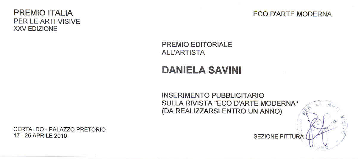 In seno al ' XXV Premio Italia per le arti visive' - 2010 Articolo precedente: "DEDICATED TO - dedicato a Paolo Baracchi" collettiva - Firenze Prec Articolo successivo: Collettiva 18-27 gennaio 2010 - Galleria d'Arte "La Telaccia" Torino Avanti