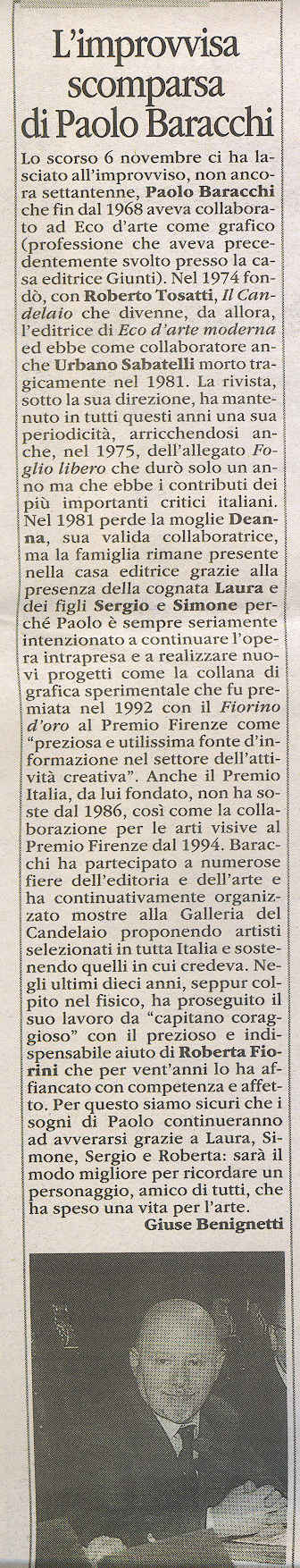 si allega articolo commemorativo "L'improvvisa scomparsa di Paolo Baracchi" di Giuse Benignetti pubblicato il 13 novembre 2009 su Metropoli, sezione Incontri con l'Arte Link