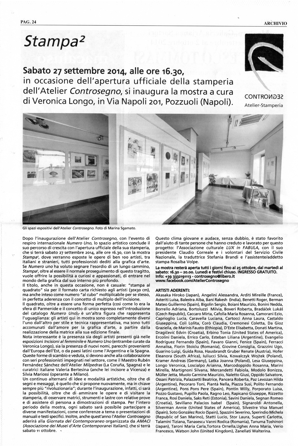 Archivio, Anno XXVI n 7, Partecipazione a 'Stampa 2' all'Atelier Controsegno di Veronica Longo {phocadownload view=file|id=20|target=s} Articolo precedente: Articolo su Gazzetta di Mantova 18-10 2014 Prec Articolo successivo: Articolo Gazzetta di Mantova giovedì 21 novembre Avanti