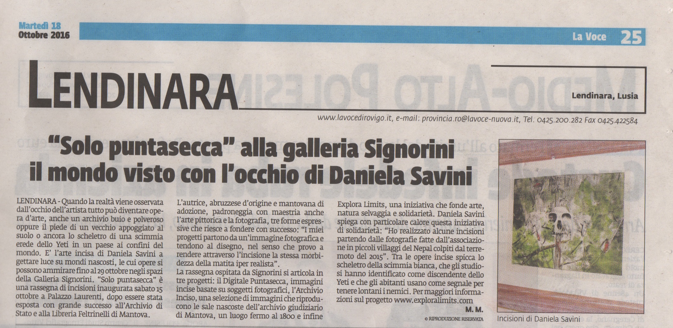 La Voce di Rovigo del 18-10-2016 - "Solo Puntasecca" Articolo precedente: Catalogo e libro d'artista: L'archivio Inciso - 2016 Prec Articolo successivo: Pubblicata una incisione nel libro Oma Tsho Avanti